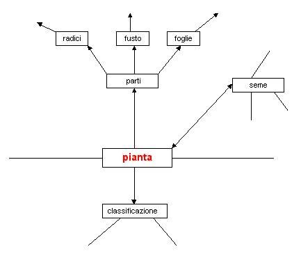 Questo � uno dei modi possibili per creare una mappa iniziale, ne puoi inventare altri tu, l'importante � che tu attribuisca un significato chiaro a ci� che disegni (perch�, ad esempio, ci sono frecce ad una direzione e frecce bidirezionali? perch� la parola "pianta" � in rosso?). In questo esempio ci sono linee o frecce senza nessun collegamento: esse aspettano che io approfondisca l'argomento per allargare ed estendere successivamente la mia mappa concettuale ... (ad esempio per radici, fusto e foglie potr� indicare le loro funzioni sulle frecce "in uscita" dalle tre parole).